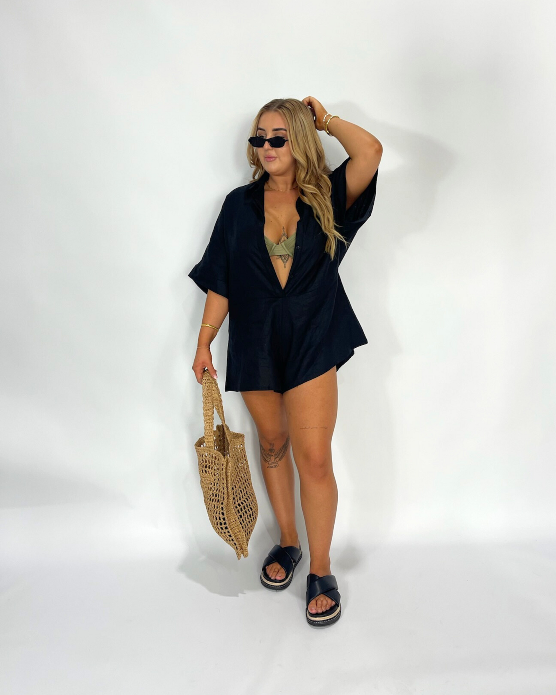 Effortlessly cool and endlessly versatile, the Loosii Linen Playsuit is your go-to for sun-drenched days and balmy nights. Crafted from 100% breathable linen, it offers a relaxed yet flattering silhouette that moves with you from morning markets to evening drinks. Featuring an overe sized style, a soft V-neckline, and subtle tailoring through the waist, it’s designed to be styled up or down with ease. Pair it with sneakers for a laid-back look or add your favourite accessories to elevate it for an evening out.