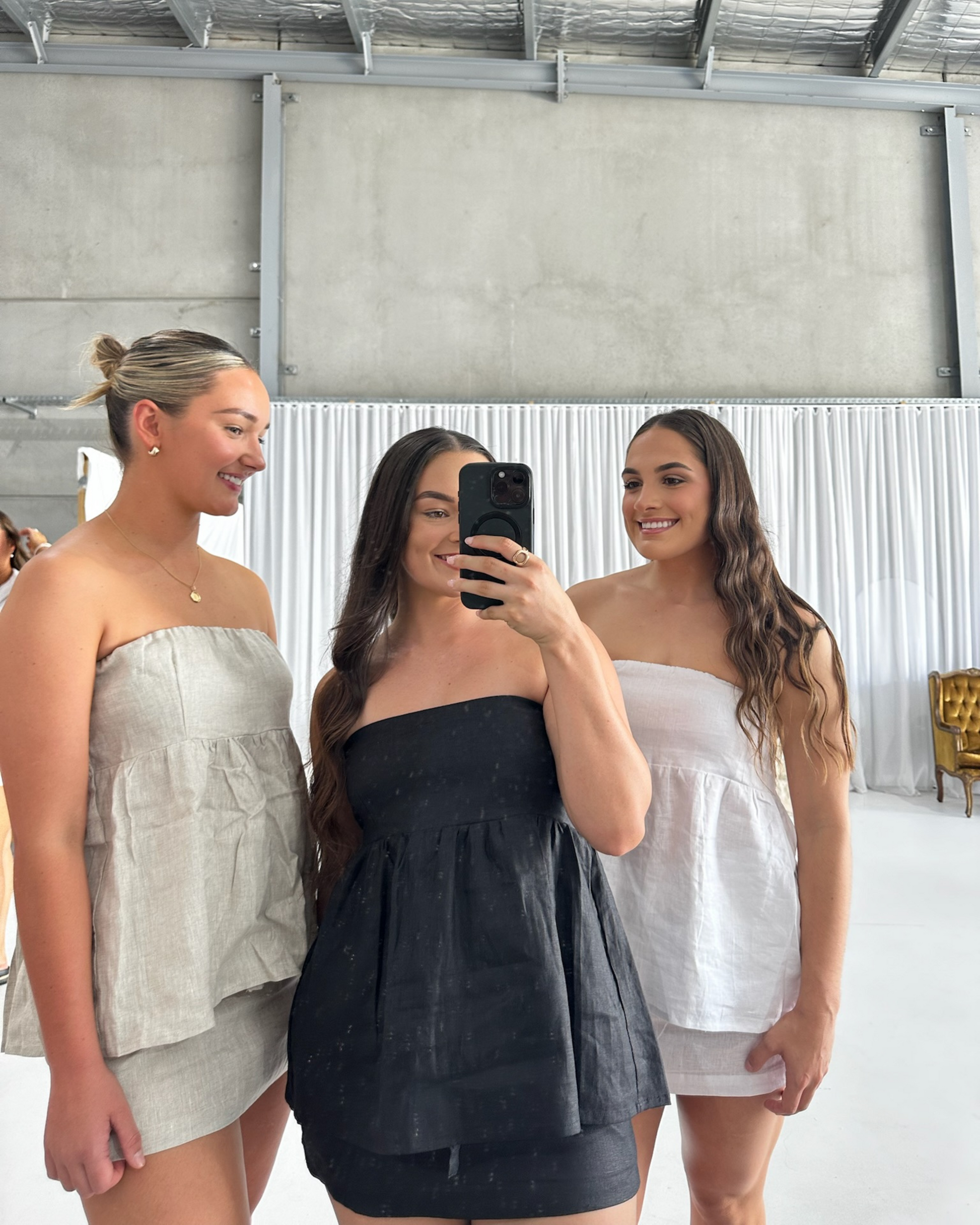 Effortlessly elegant, this two-piece linen set is your go-to for elevated ease. Featuring a flowy, strapless top that drapes softly over the body and a fitted skirt that flatters the silhouette, it’s the perfect blend of structure and softness. Designed for warm days and balmy nights, this set transitions seamlessly from beachside brunches to sunset drinks.